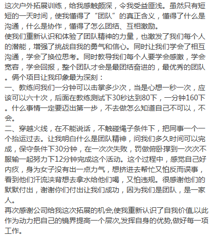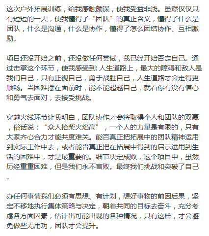 此次拓展團(tuán)建活動,不僅培養(yǎng)了大家的積極的工作態(tài)度和高度的工作責(zé)任心,充分開發(fā)了個人潛力,還讓大家深刻體會到了團(tuán)隊的力量以及相互溝通協(xié)作的重要性,這為以后的工作奠定了很好的基礎(chǔ)。離開了拓展訓(xùn)練基地,回到更為廣闊的工作環(huán)境,我們相信,只要我們充分發(fā)揮拓展活動中互助互信的團(tuán)隊精神,把每一件工作當(dāng)作是拓展訓(xùn)練中的一次挑戰(zhàn),就沒有戰(zhàn)勝不了的困難,沒有解決不了的難題!