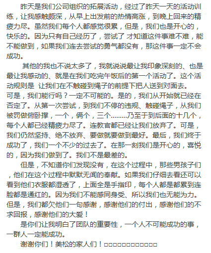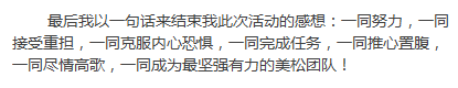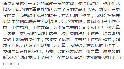 本次活動,同事們在實踐鍛煉中學(xué)習(xí),在體驗學(xué)習(xí)中改變,受益匪淺,有了更多的人生感悟。在體驗著奉獻(xiàn)、協(xié)作、勇敢?guī)淼某晒ο矏偤?,每個人深刻感受到|溝通、責(zé)任、協(xié)作、勇敢、自信|的精髓,以及作為團(tuán)隊中的一員所要承擔(dān)的責(zé)任,正如美松智能總經(jīng)理黃楊靜先生及同事們所言,利用周日休息天還在撰寫感悟傳遞著: