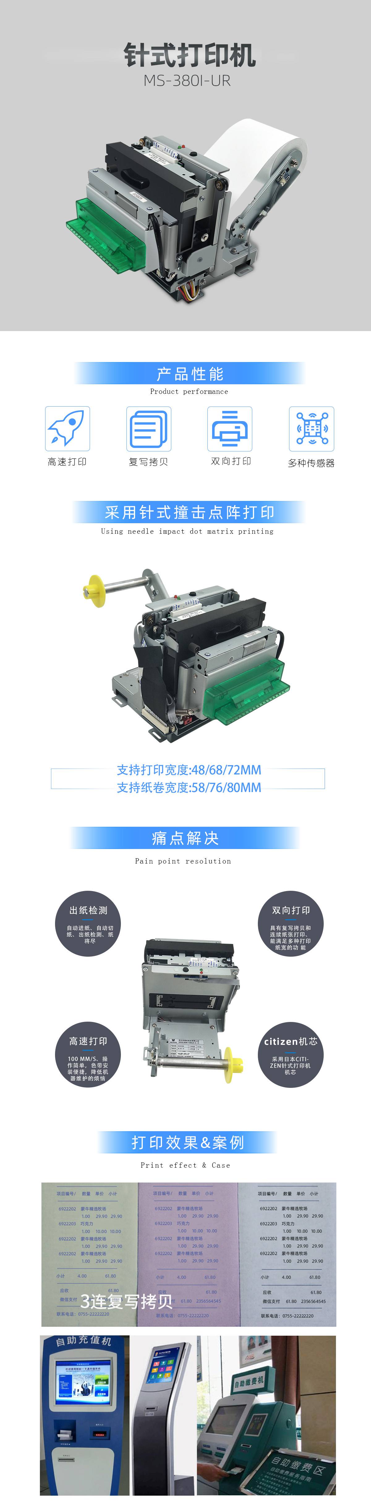 美松嵌入式針式票據(jù)打印機 MS-380I-UR打印一體機是由日本citizen針式打印機機芯,與公司自主研發(fā)的針式打印機控制主板相結(jié)合的一款打印一體機。是一種針式撞擊點陣打印方式的打印機,可靠性強,具有復(fù)寫拷貝和連續(xù)紙張打印、能滿足多種打印紙寬的功能,控制板結(jié)構(gòu)小巧,操作簡單,色帶安裝便捷,降低機器維護的煩惱。