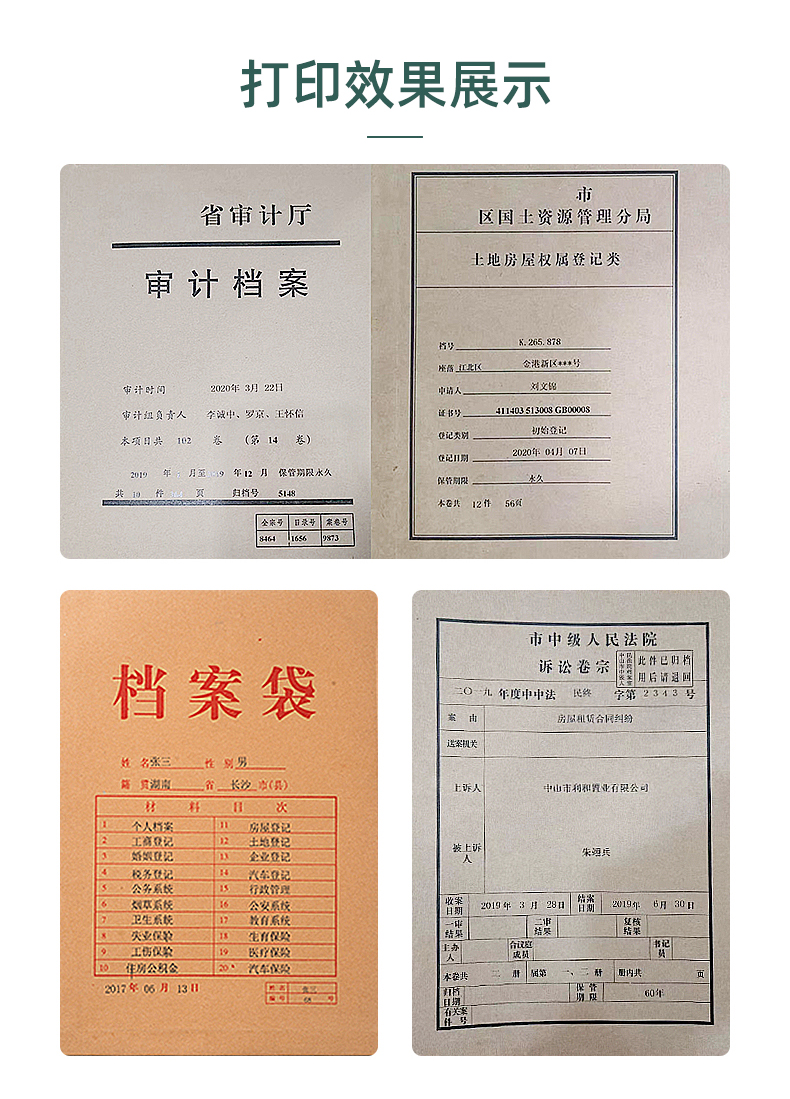 熱轉(zhuǎn)印打印機原理:熱轉(zhuǎn)印技術(shù)利用碳帶介質(zhì)通過熱敏片遇熱和壓力轉(zhuǎn)印到紙或薄膜的過程,當卷宗卷皮的單張空白版面牛皮紙,無酸紙,證件內(nèi)頁紙通過打印機的打印頭和壓軸時,將碳帶上的碳粉轉(zhuǎn)印到標簽上, 最終形成文字或圖案。