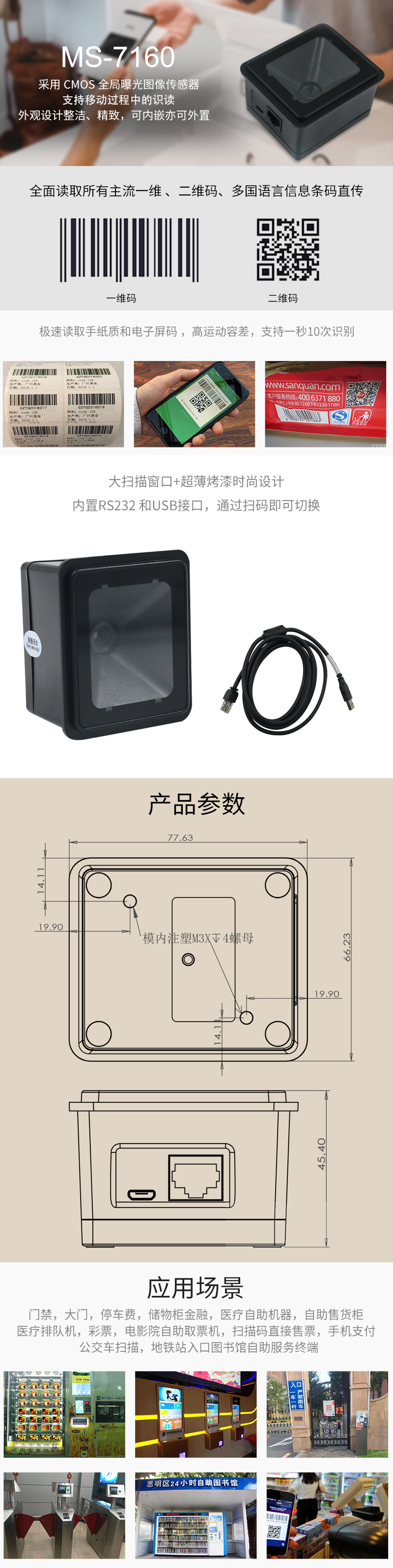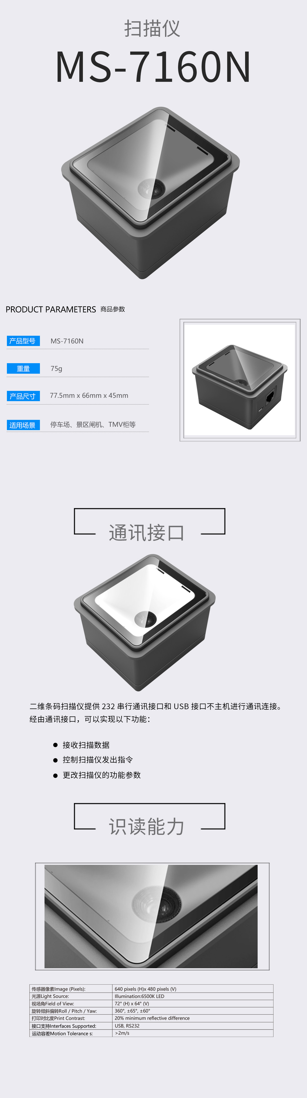 美松嵌入式掃描模塊MS-7160N掃描物體自感應,多國語言條碼信息直傳,內置RS232和USB接口,大視角影像感光器,支持紙質條碼和無背光屏幕條碼讀取,二維碼掃描平臺,嵌入式掃描模塊,電子支付盒固定式掃碼盒可二次開發(fā).全面讀取所有主流一維 ,二維碼,多國語言信息條碼直傳;物體自感應,2M/S運動容差;內置RS232 和USB接口,通過掃碼即可切換;3.3-5V寬電壓輸入,無懼電壓波動;大掃描窗口+超薄烤漆時尚設計;極速讀取手紙質和電子屏碼。