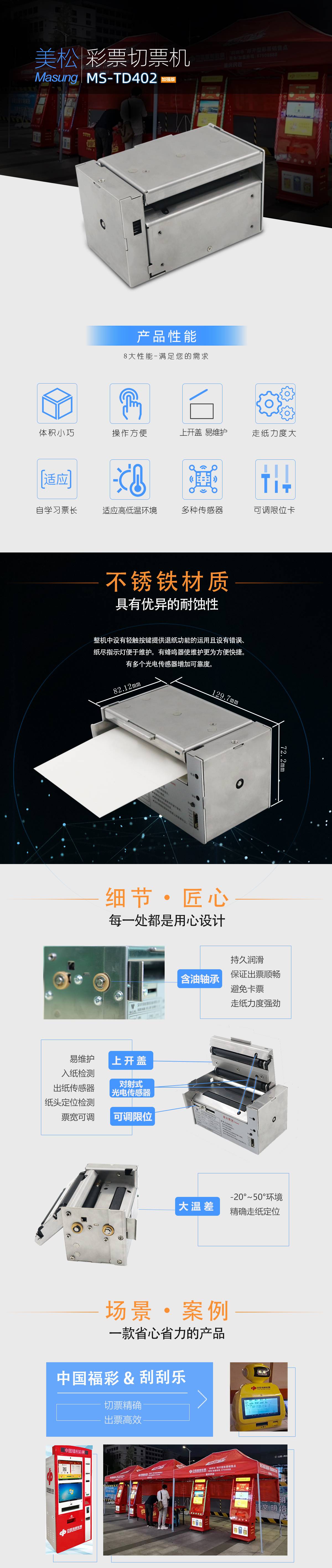 美松MASUNG自主研發(fā)即開(kāi)型彩票切票機(jī) 1.切刀是鈍刀鋒,沒(méi)有刀片磨損無(wú)法切票的情況,保證彩票的分割質(zhì)量 2.Windows/ Android在線遠(yuǎn)程升級(jí)功能 3.USB/RS232兩種接口,適用領(lǐng)域廣 4.送票軸有兩組,保證送票時(shí)順暢,避免卡票 5.不銹鐵材質(zhì),結(jié)構(gòu)強(qiáng)度高,工作可靠適用領(lǐng)域廣