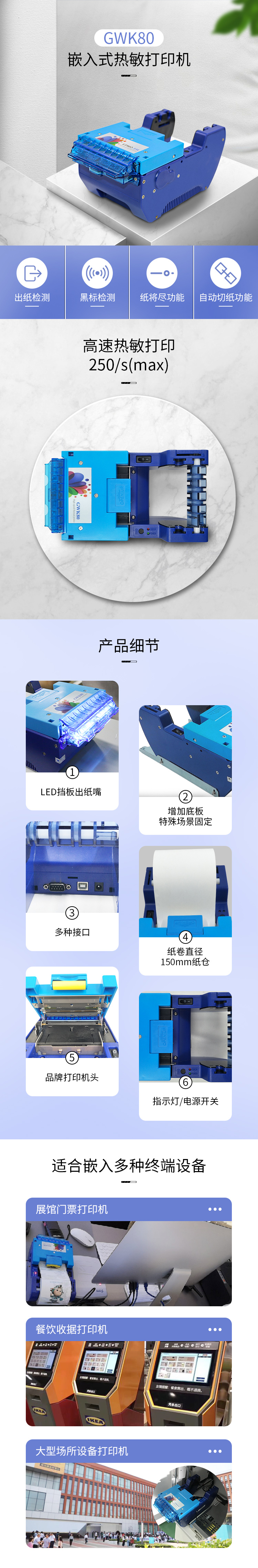 GWK80自助零售餐飲收銀小票機(jī),票據(jù)單據(jù)收據(jù)專用打印機(jī) 送貨單銷貨單打印,80mm熱敏打印機(jī),可打印80毫米或82.5毫米的紙寬,入紙口與出紙口水平出紙,為走紙?zhí)峁╊愃茩C(jī)場跑到的場地,極大限度保證走紙順暢,避免打印卡紙,降低打印故障,防堵防拽LED擋板出紙嘴,隨時(shí)檢測走紙情況,黑標(biāo)檢測功能,檢測黑標(biāo)位置并實(shí)現(xiàn)打印,適用于電影院和彩票等行業(yè).GWK80適用于打印量大、打印內(nèi)容特殊化、票據(jù)格式多樣化等行業(yè)的應(yīng)用,應(yīng)用場景多見于醫(yī)院、銀行、政務(wù)、交通等人流量較多的行業(yè)。