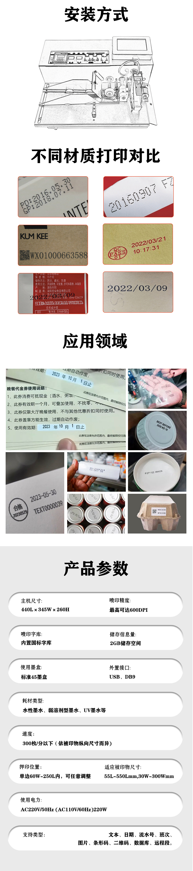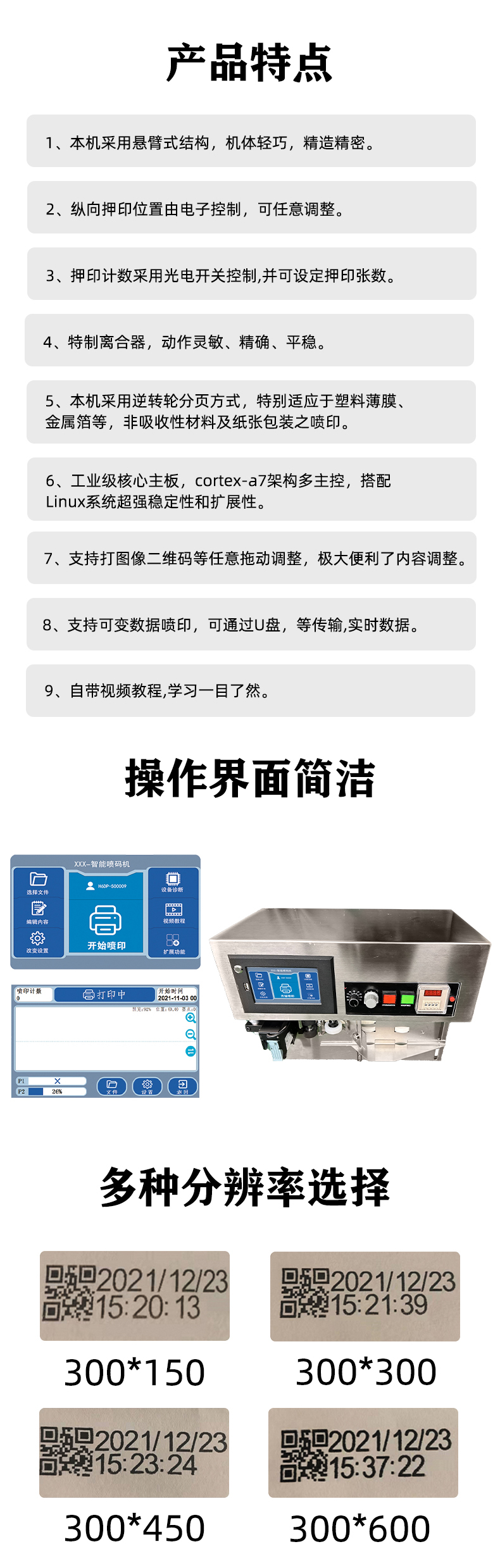 1、本機(jī)采用懸臂式結(jié)構(gòu),機(jī)體輕巧,精造精密。 2、縱向押印位置由電子控制,可任意調(diào)整。 3、押印計(jì)數(shù)采用光電開關(guān)控制,并可設(shè)定押印張數(shù)。 4、特制離合器,動(dòng)作靈敏、精確、平穩(wěn)。 5、本機(jī)采用逆轉(zhuǎn)輪分頁方式,特別適應(yīng)于塑料薄膜、 金屬箔等,非吸收性材料及紙張包裝之噴印。 6、工業(yè)級(jí)核心主板,cortex-a7架構(gòu)多主控,搭配Linux系統(tǒng)超強(qiáng)穩(wěn)定性和擴(kuò)展性。 7、支持打圖像二維碼等任意拖動(dòng)調(diào)整,極大便利了內(nèi)容調(diào)整。8、支持可變數(shù)據(jù)噴印,可通過U盤,等傳輸,實(shí)時(shí)數(shù)據(jù)。傳輸,實(shí)時(shí)數(shù)據(jù)。