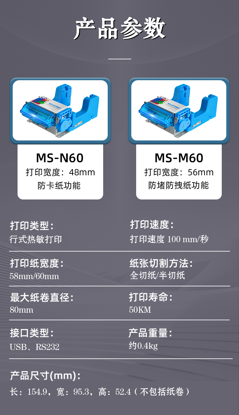 MS-N60/M60是美松全新研發(fā)的一款新的熱敏票據(jù)打印機,完全取代MS-D245熱敏票據(jù)打印機,可打印熱敏不干膠標簽。MS-N60/M60對工作電壓進行了全新的升級,現(xiàn)在的工作電壓在12V±5%V,使自助機的整體運行更方便,具有高亮LED燈光出紙嘴,可對打印頭溫度、缺紙、黑標、紙將盡、防堵、防拽等熱門功能需要進行配置,MS-N60/M60可應(yīng)用于自助快遞柜、商超存包柜、自助排隊機、自助取票機等多種自助票據(jù)設(shè)備 MS-N60打印的尺寸為48mm;MS-M60打印的尺寸為56mm,帶防堵防拽紙功能。