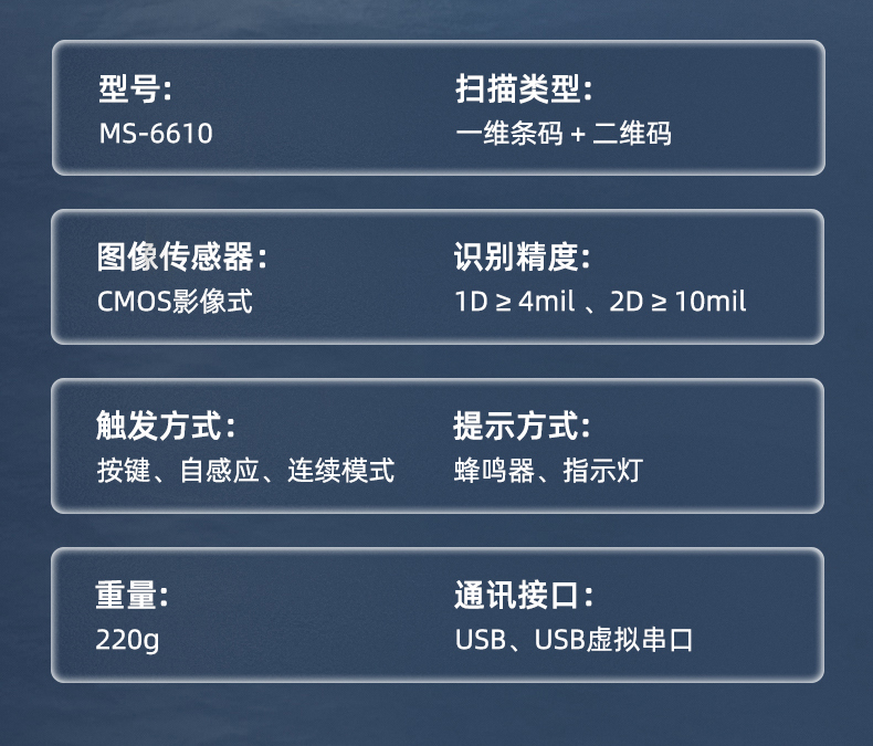 產(chǎn)品特點(diǎn): 全局高速解碼技術(shù) 采用自主研發(fā)的核心技術(shù),極速響應(yīng), 支持快速開發(fā)和定制需求 采用二維掃描技術(shù) 兼容一維碼和二維碼的讀取 手機(jī)和紙質(zhì)條碼讀取 采用高速曝光算法,兼容手機(jī)碼和紙質(zhì)碼的快速讀取 支持多國鍵盤 對(duì)不同國家場(chǎng)景可配置對(duì)應(yīng)輸出鍵盤 人體工學(xué)設(shè)計(jì) 采用經(jīng)典的人體工學(xué)設(shè)計(jì),符合用戶使用習(xí)慣 全ASCII數(shù)據(jù)編輯 支持全ASCII數(shù)據(jù)編輯,可配置輸出結(jié)果格式 支持開票模式 可配置為開票模式,實(shí)現(xiàn)發(fā)票碼格式轉(zhuǎn)換及輸出