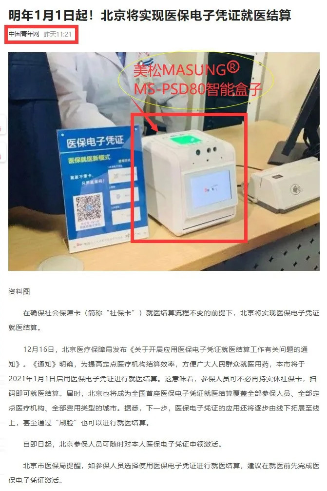 據(jù)中國(guó)青年網(wǎng)報(bào)道,2021年1月1日起,北京將實(shí)現(xiàn)醫(yī)保電子憑證就醫(yī)結(jié)算,美松MS-PSD80集打印掃描結(jié)算 智能 一體機(jī)亮相北京助力醫(yī)保事業(yè)。