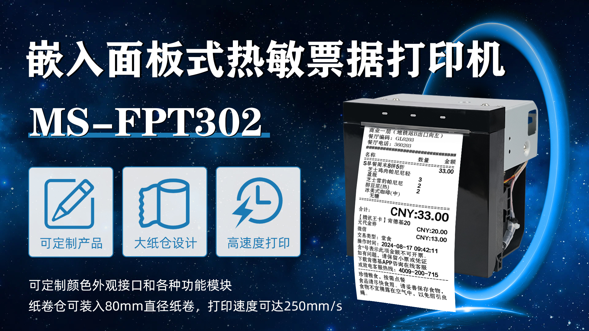 MS-FPT302的打印速度可達(dá)到250mm/s,高效的打印能輕松緩解人流高峰期出現(xiàn)的排長隊(duì)現(xiàn)象,MS-FPT302的紙倉容量可裝入直徑為80mm的紙卷,無需擔(dān)心紙倉容量過小,需天天更換的問題,對于軟件系統(tǒng),可以輕松兼容多種軟件。