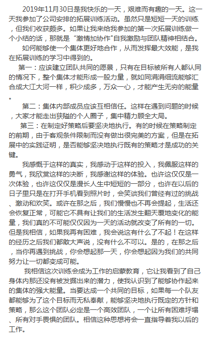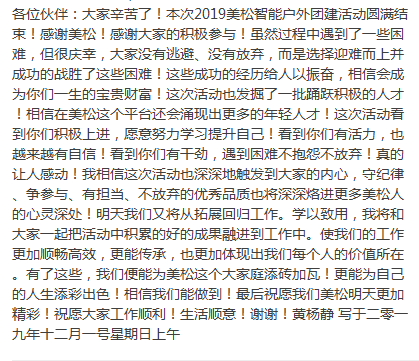 本次活動,同事們在實踐鍛煉中學(xué)習(xí),在體驗學(xué)習(xí)中改變,受益匪淺,有了更多的人生感悟。在體驗著奉獻(xiàn)、協(xié)作、勇敢?guī)淼某晒ο矏偤?,每個人深刻感受到|溝通、責(zé)任、協(xié)作、勇敢、自信|的精髓,以及作為團(tuán)隊中的一員所要承擔(dān)的責(zé)任,正如美松智能總經(jīng)理黃楊靜先生及同事們所言,利用周日休息天還在撰寫感悟傳遞著: