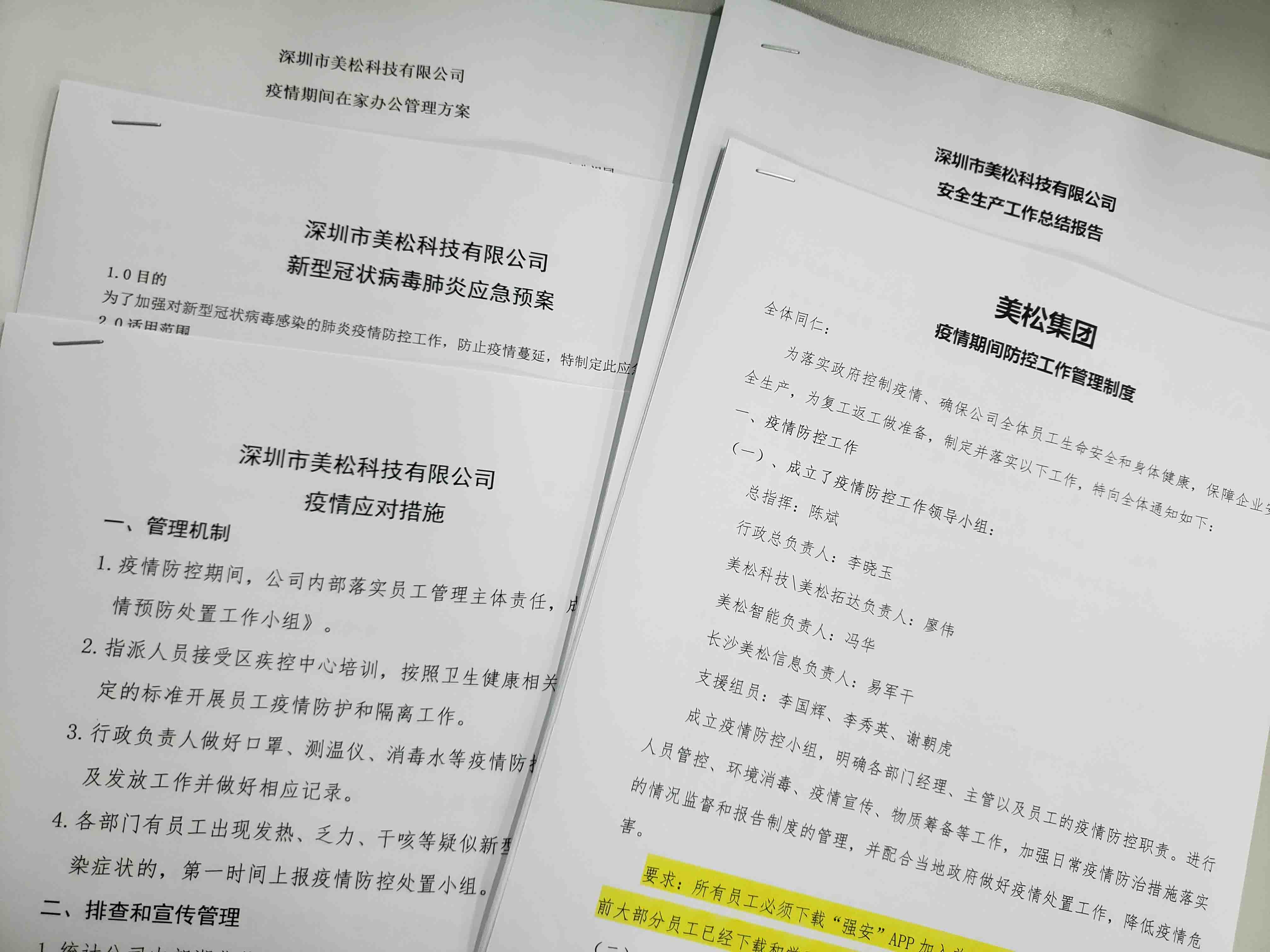 開工復(fù)工在即,我們美松集團(tuán)及各下屬子公司也做了充分準(zhǔn)備工作,面對如此特殊疫情時(shí)期,深圳美松集團(tuán)特制定了《疫情期間防控工作管理制度》、《疫情期間在家辦公管理方案》、《安全生產(chǎn)工作報(bào)告》、《應(yīng)對疫情應(yīng)對措施》、《新型冠狀病毒應(yīng)急預(yù)案》,利用網(wǎng)絡(luò)、電話、現(xiàn)場等多種形式相結(jié)合的方式為客戶提供服務(wù),保障客戶需要,通過差異化的管理,做到疫情防控和經(jīng)營服務(wù)“兩不誤”。無論是在家辦公,還是到崗辦公,全體員工全身心投入到工作當(dāng)中,保持著積極的工作熱情。