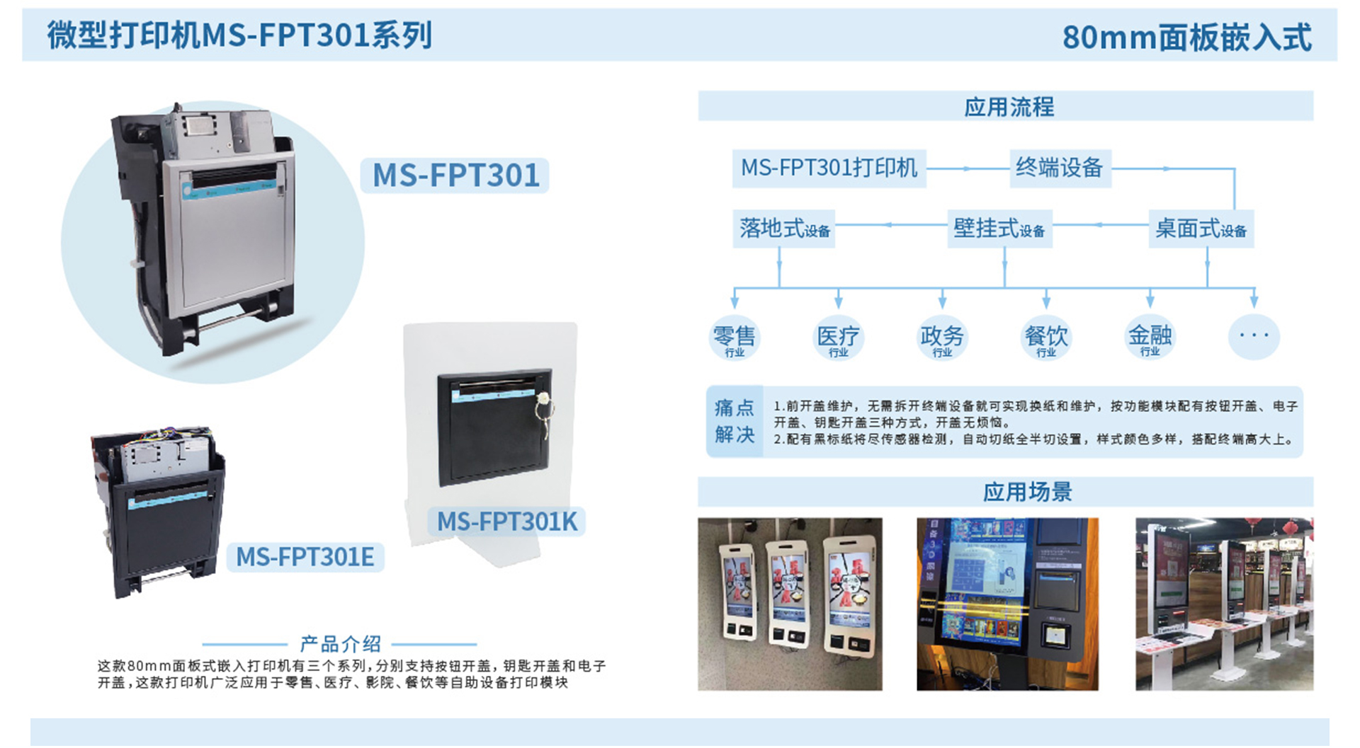 美松MASUNG微型打印機(jī)廣泛應(yīng)用在落地式、壁掛式、桌面式自助終端設(shè)備上,實現(xiàn)打印票據(jù)功能的模塊。在金融行業(yè),微型打印機(jī)可嵌入ATM機(jī)、自助繳費機(jī)、自助存取款機(jī)提供打印需求;在醫(yī)療服務(wù)行業(yè),微型打印機(jī)嵌入自助掛號繳費機(jī)、自助取單查詢機(jī)提供打印模塊;在消費零售行業(yè),微型打印機(jī)為自助售貨機(jī)、自助加油機(jī)、自助點餐機(jī)、自助取票機(jī),新零售自助結(jié)算機(jī)等自助設(shè)備提供排號打印的功能;在公共服務(wù)行業(yè),微型打印機(jī)適配AFC系統(tǒng),自助圖書館服務(wù)機(jī)、自助稅務(wù)機(jī)等終端設(shè)備,提供打印模塊。