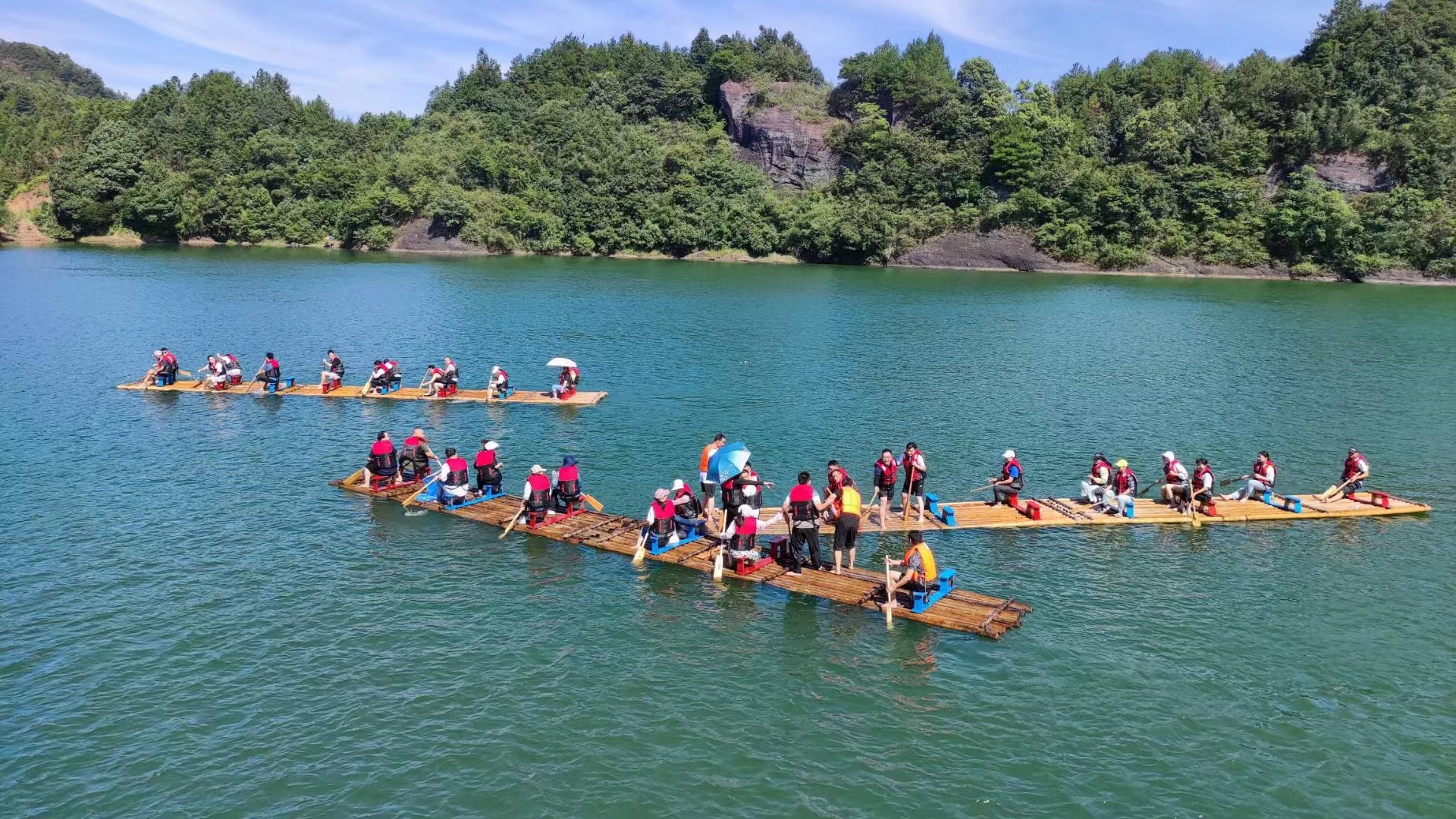 第二天上午來到丹霞湖,陽光明媚,景色宜人。三條比賽竹筏一字排開,在教練一聲令下破浪而出。船槳拍打水面聲、吶喊加油聲響絕于耳。美松選手們英姿颯爽,頑強(qiáng)拼搏的同時(shí)船只之間嬉戲潑水打鬧。這項(xiàng)活動(dòng)不僅體現(xiàn)了它的有趣與意義,還增進(jìn)了溝通和交流,更增加了協(xié)作意識(shí),提升了團(tuán)隊(duì)凝聚力,為美松后期工作再創(chuàng)佳績(jī)注入了活力。