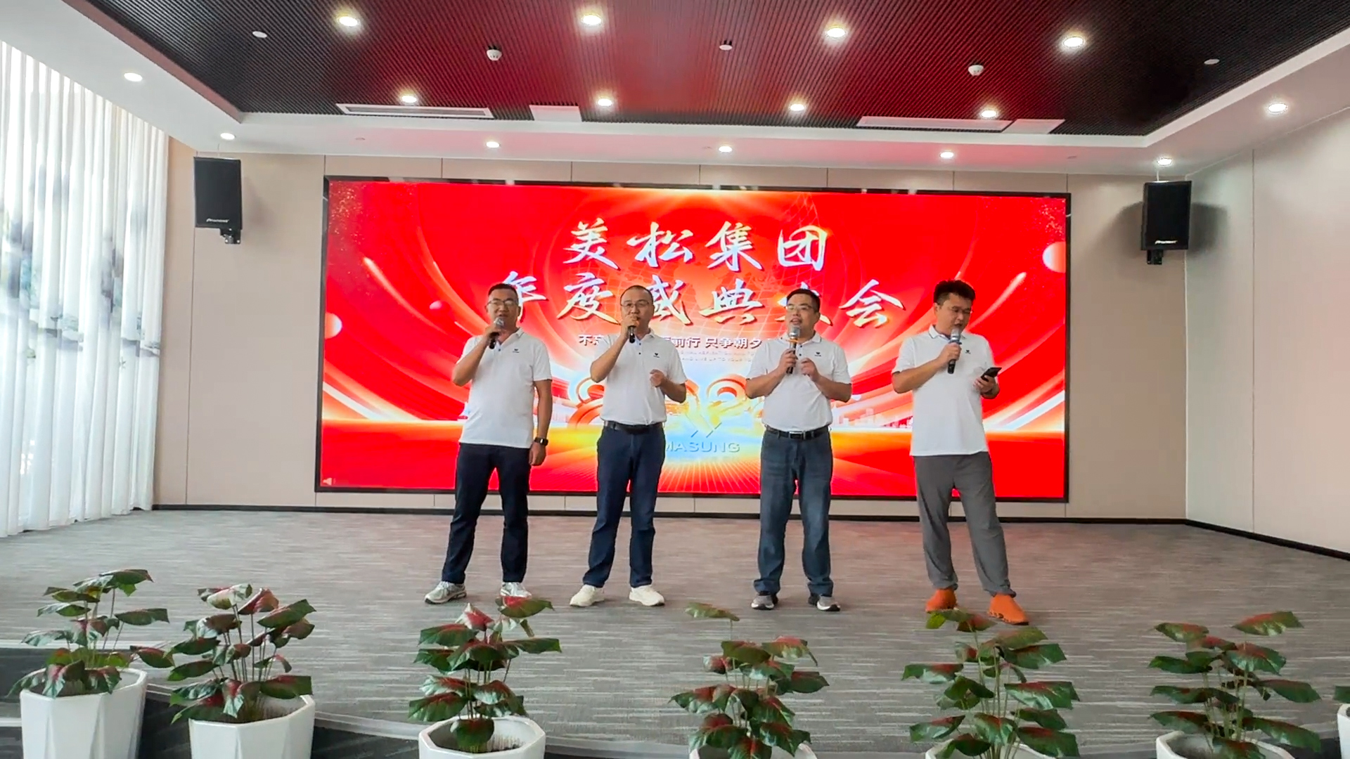 四位主持人整齊亮相開啟序幕,由美松智能銷售部總經(jīng)理李光輝帶領的” 四大金剛”上臺領唱美松主題曲《我的夢》,當歌聲響起,現(xiàn)場激勵氣氛高漲。
