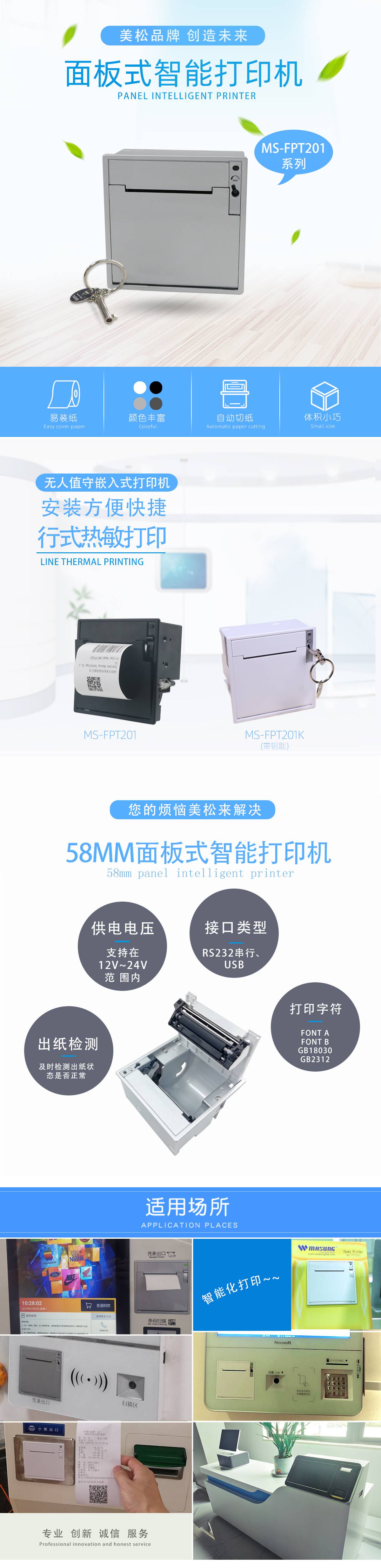 微型打印機(jī)介紹:與80mm微型熱敏打印機(jī)不同,這款是58MM的微型打印機(jī),型號(hào)為MS-FPT201微型打印機(jī)是一款58mm嵌入式微型打印機(jī),體積小巧,塑膠材料外殼,機(jī)身重量輕巧,配有鋅合金鑰匙開(kāi)蓋,滿足不同需求的應(yīng)用場(chǎng)合,只需要簡(jiǎn)單安裝就能實(shí)現(xiàn)打印功能的打印模塊,嵌入在不同的終端設(shè)備,例如加油站、餐飲收銀機(jī)、排隊(duì)繳費(fèi)機(jī)等,微型熱敏打印機(jī)是排隊(duì)機(jī),POS機(jī),加油站設(shè)備及醫(yī)療掛號(hào)繳費(fèi)等行業(yè)自助終端打印設(shè)備。