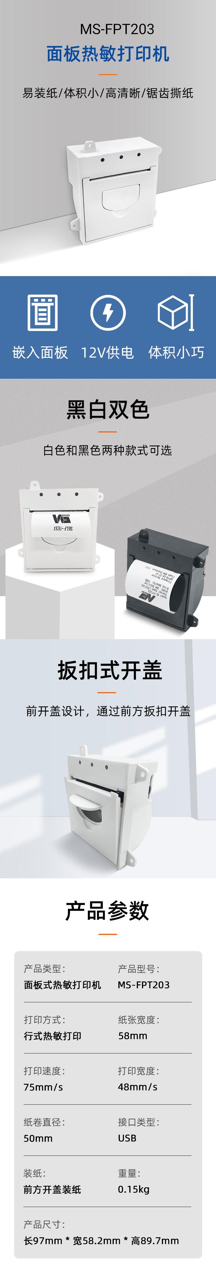 微型打印機(jī)介紹:與80mm微型熱敏打印機(jī)不同,這款是58MM的微型打印機(jī),型號為MS-FPT203微型打印機(jī)是一款58mm嵌入式微型打印機(jī),只需要簡單安裝就能實(shí)現(xiàn)打印功能的打印模塊,嵌入在不同的終端設(shè)備,例如加油站、餐飲收銀機(jī)、排隊(duì)繳費(fèi)機(jī)等,微型熱敏打印機(jī)是排隊(duì)機(jī),POS機(jī),游戲機(jī)以及儀器設(shè)備嵌入使用。