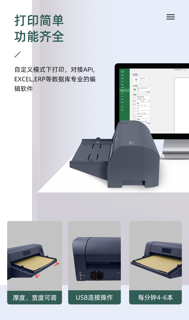 美松MASUNG自主研發(fā)熱轉(zhuǎn)印封面打印機 1.專業(yè)打印牛皮紙,不動產(chǎn)等證件內(nèi)頁,無酸紙檔案盒 2.對接API,EXCEL,ERP等數(shù)據(jù)庫專業(yè)的編輯軟件,自定義打印 3.USB連接操作簡單,耗材成本低,長久保存 4.快速打印,每分鐘4-6本,整齊規(guī)范化 5.進紙厚度可調(diào),適合不同封面打印