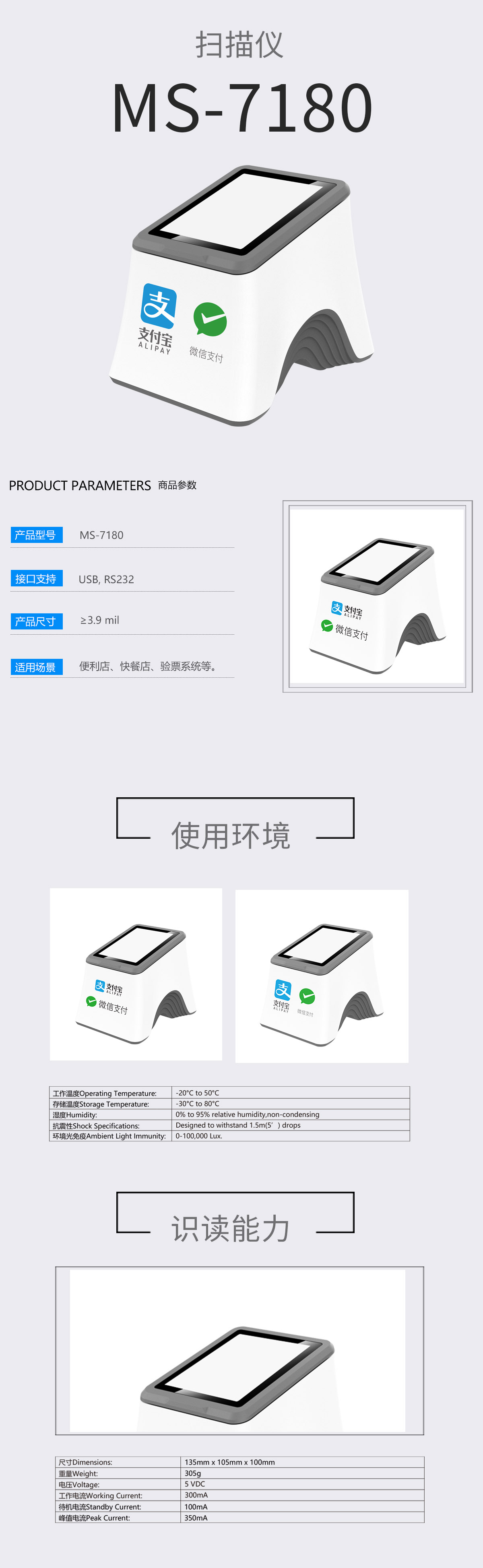 美松二維碼掃描模塊MS-7180掃描二維碼收款,條碼掃描收款,大窗口模式,支持貼屏掃碼,無需對準(zhǔn);支持微信,支付寶,美團(tuán)等掃碼支付;掃碼成功語音播報 ,解放收銀員,更避免漏單;接口豐富,內(nèi)置RS232 和USB接口;經(jīng)典外觀設(shè)計,視場40.5°(H)x31°(V),運(yùn)動容差>2m/s,接口支持USB, RS232,掃碼槍二維碼支付盒子,掃描平臺,超市收銀,醫(yī)院藥店電子醫(yī)保卡,社???健康碼掃描器掃碼墩小白盒,手機(jī)支付/電子醫(yī)???健康碼.