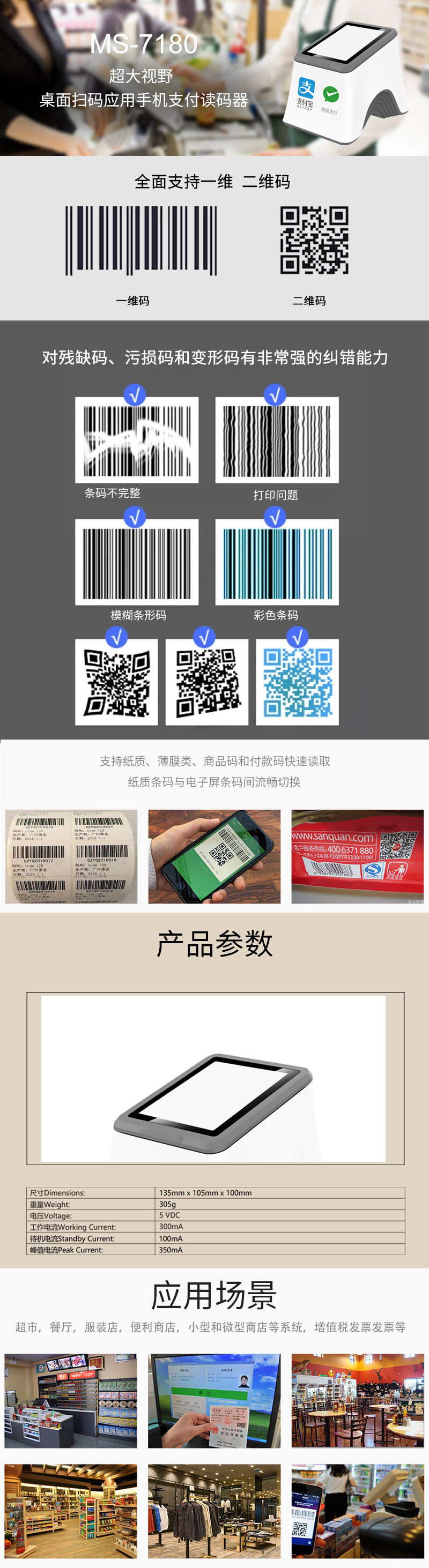 美松二維碼掃描模塊 1.大窗口模式,支持貼屏掃碼,無需對準(zhǔn) 2.支持微信,支付寶,美團(tuán)等掃碼支付 3.掃碼成功語音播報,解放收銀員,更避免漏單 4.接口豐富,內(nèi)置RS232 和USB接口 5.經(jīng)典外觀設(shè)計