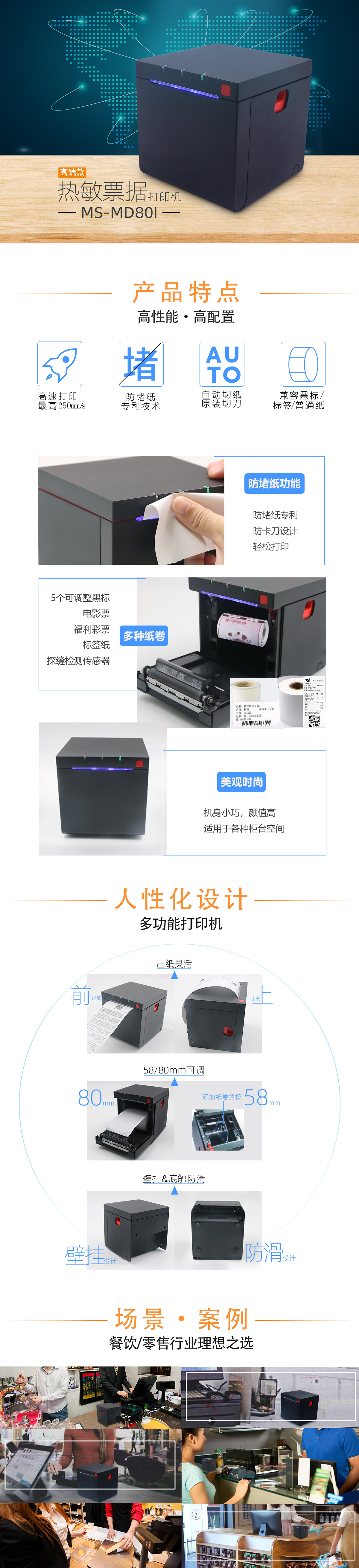 美松MS-MD80I打印機(jī)是前臺(tái)80mm后廚超市餐廳收銀票據(jù)打印機(jī),用于便利店商超餐飲收銀,可滿足熱敏紙打印,黑標(biāo)紙打印,不干膠紙打印,標(biāo)簽紙打印功能,防堵防拽紙專利技術(shù),具有高速打印,噪聲低,可靠性強(qiáng),打印質(zhì)量高,切紙厚度大,結(jié)構(gòu)小巧等特點(diǎn),使安裝維修更方便快捷.擁有易裝紙,滑動(dòng)式自動(dòng)切紙等功能.
