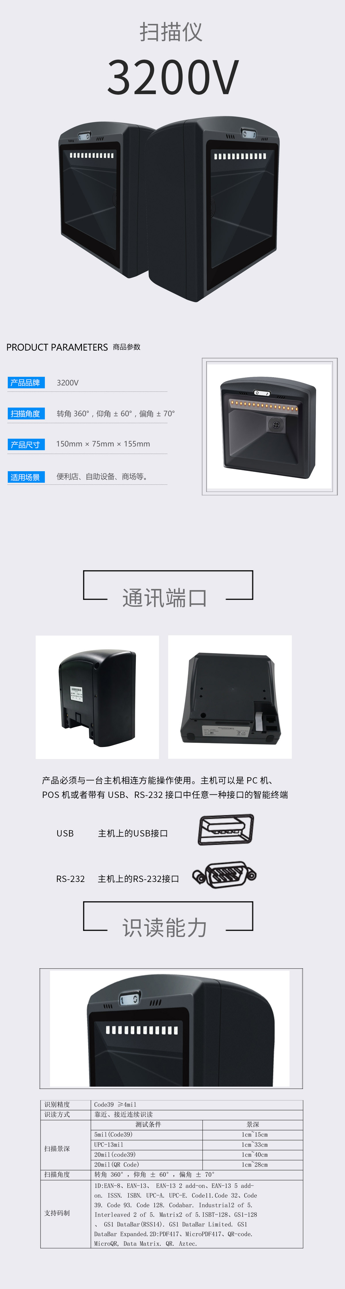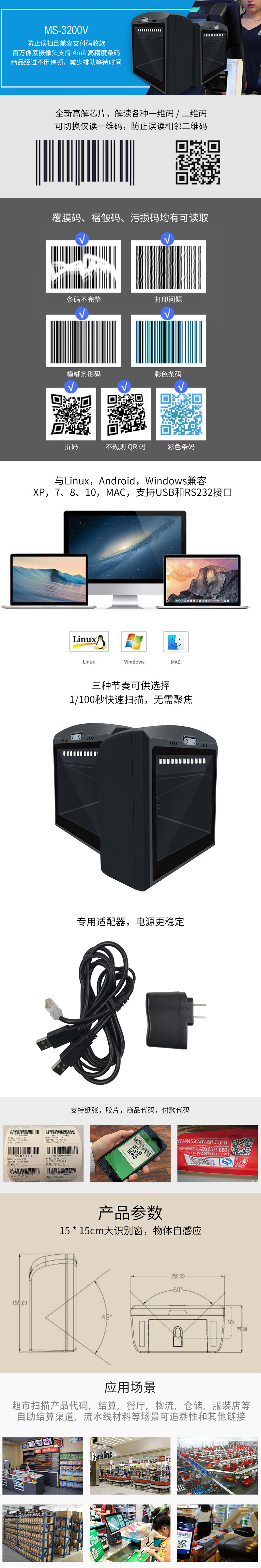 美松二維碼掃描平臺(tái)MS-3200V掃描完全自主研發(fā),擁有全套專利,即插即用無(wú)需安裝驅(qū)動(dòng).寬電壓設(shè)計(jì),專用適配器,供電更穩(wěn)定,避免了因電壓波動(dòng)導(dǎo)致數(shù)據(jù)傳輸無(wú)法上傳情況的發(fā)生.采用 32 位主控芯片搭載專利軟體,可順暢解讀反光,打皺,模糊,彩色條碼,強(qiáng)光及暗光環(huán)境下也可正常解碼.采用全鉭電容及抗氧化光學(xué)工藝,避免了傳統(tǒng)掃描槍使用一段時(shí)間后靈敏度下降問題.二維影像式掃描平臺(tái),掃描槍,掃碼器,餐飲零售,快遞倉(cāng)儲(chǔ),物流超市,商品條碼,手機(jī)屏幕掃碼收款.兼容Linux,Android,Windows XP,7,8,10,MAC,支持USB和RS232接口.支持紙質(zhì),薄膜類,商品碼,付款碼讀取,支持低對(duì)比度,高密度的DM碼等的讀取.