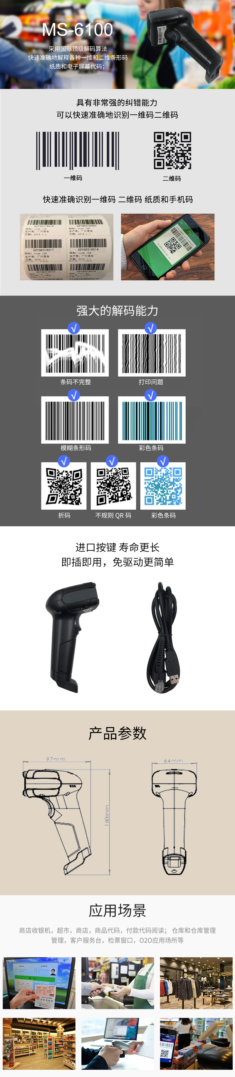 美松一二維碼影像式掃描槍MS-6100掃描采用國際解碼算法,即插即用,免驅(qū)動(dòng)更簡單,對(duì)各種一維,二維條碼,紙質(zhì)和電子屏碼均以快速精準(zhǔn)解讀;尤其對(duì)殘缺碼,污損碼和變形碼有非常強(qiáng)的糾錯(cuò)能力,兼容WINDOWS ,Linux,安卓等主流操作系統(tǒng),廣泛用于零售餐飲倉庫快遞行業(yè),手機(jī)屏幕收銀行業(yè).