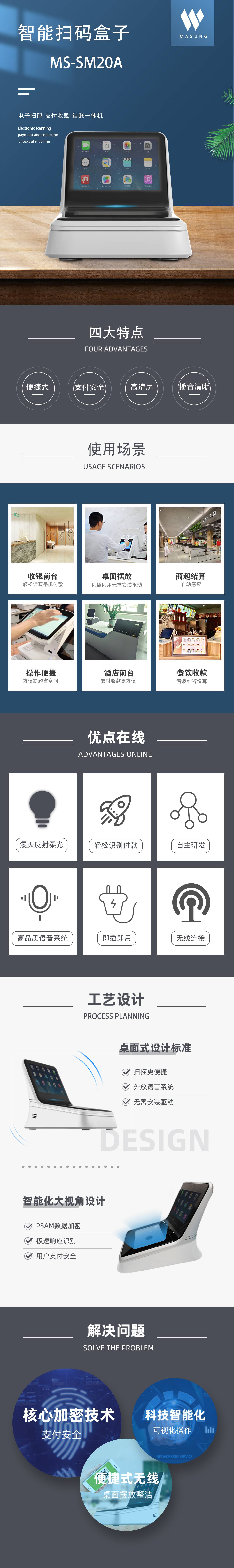 美松二維碼支付收款機(jī)MS-SM20A智能盒子采用掃一掃,二維碼,雙聲道立體音喇叭外放,商家只需用戶提供收款碼就可實(shí)現(xiàn)快速收款的收款機(jī),二維碼掃描,對商家收款帶來便利,對用戶二維碼支付提供安全,交易實(shí)現(xiàn)快速精準(zhǔn)安全模式.電子掃碼,支付收款,結(jié)賬一體的設(shè)備,支持微信,支付寶,公交碼支付,掃碼成功語音播報(bào) ,解放收銀員,更避免漏單,接口:網(wǎng)口,4G和USB,經(jīng)典外觀設(shè)計(jì)。