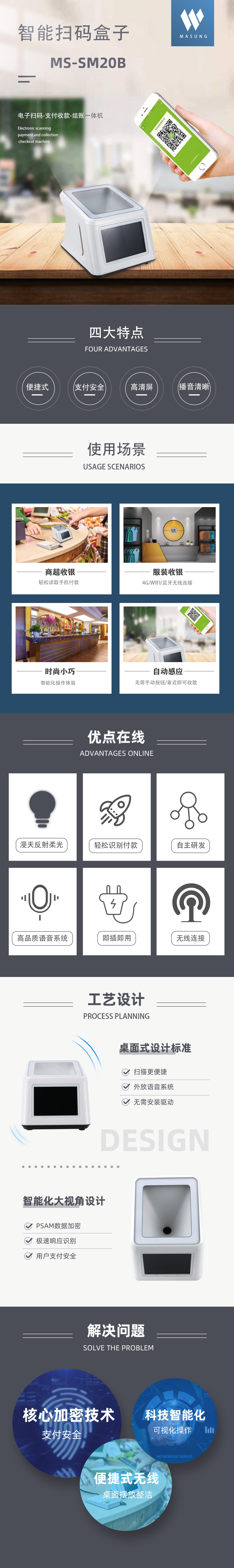 美松二維碼支付收款機MS-SM20B智能盒子采用掃一掃,二維碼,雙聲道立體音喇叭外放,商家只需用戶提供收款碼就可實現(xiàn)快速收款的收款機,二維碼掃描,對商家收款帶來便利,對用戶二維碼支付提供安全,交易實現(xiàn)快速精準(zhǔn)安全模式.電子掃碼,支付收款,結(jié)賬一體的設(shè)備,支持微信,支付寶,公交碼支付,掃碼成功語音播報 ,解放收銀員,更避免漏單,接口:網(wǎng)口,4G和USB,經(jīng)典外觀設(shè)計.