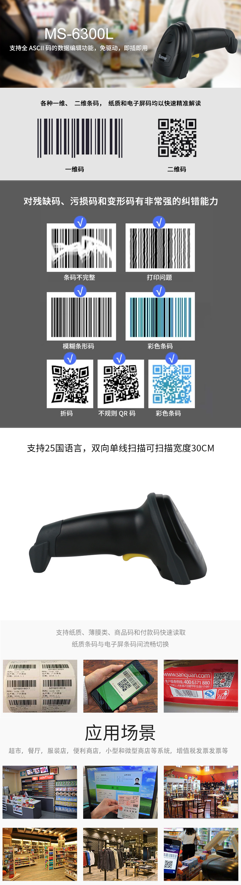 UPC/EAN、Code128、Code39、Code 39Full ASCII、Code32、Coda bar、industrial /Interleaved 2 of 5 Code93、MSI、Code11、ISBN、ISSN、China post、GS1 Data Bar、etc. |