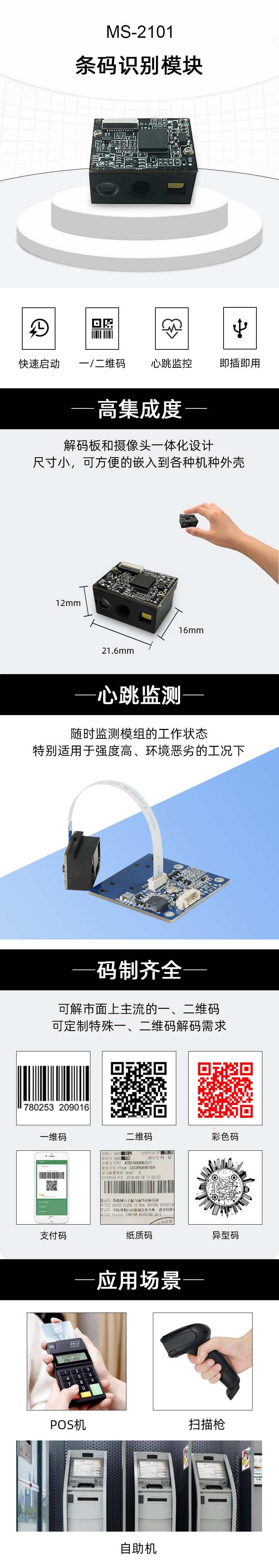帶補光燈和指示燈,對紙質條碼掃描效果好 采用廣角鏡頭,掃碼可以貼的更近,符合貼近掃描習慣 心跳監(jiān)測在線狀態(tài) 兼容市面上常見模組固定孔 選配轉接板可端子線連接RS232,TTL3.3V,TTL5V,USB,USB虛擬串口
