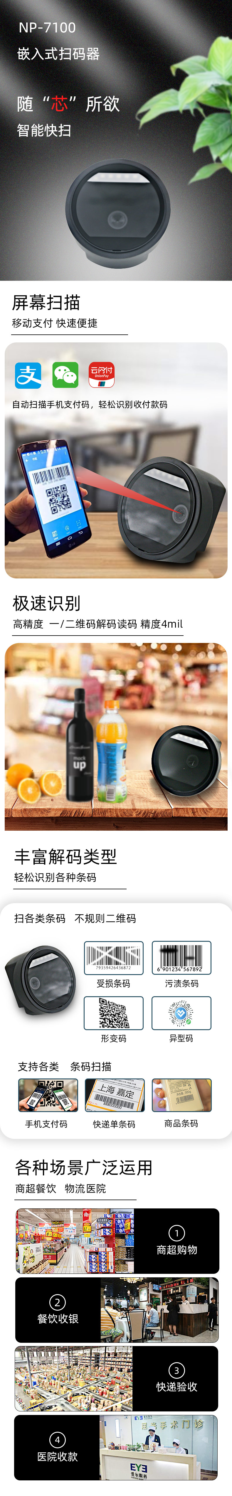 極速識讀各種商品碼和支付碼 嵌入式設(shè)計,外形簡約、大氣 62MM厚,結(jié)構(gòu)設(shè)計更方便