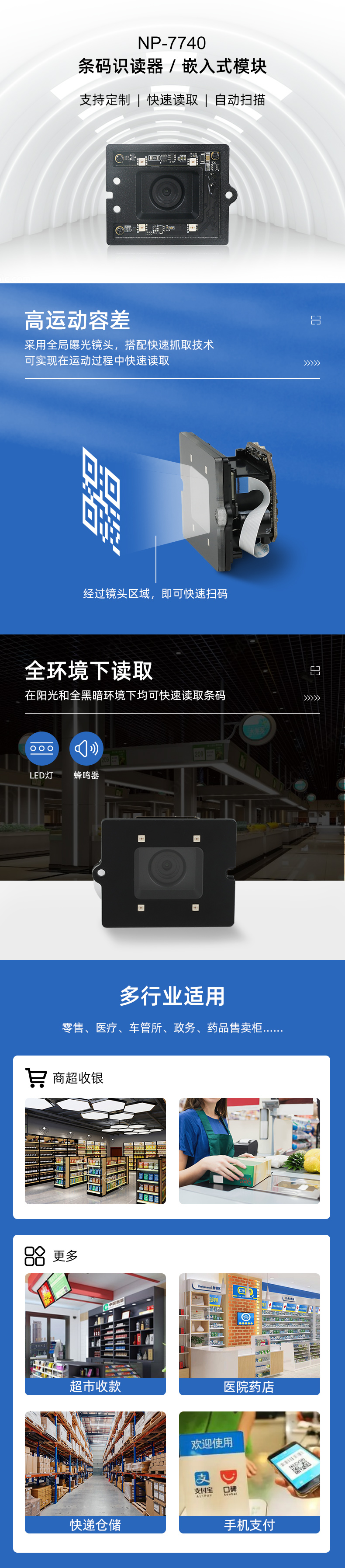 領先解碼技術 采用自主研發(fā)的核心技術,極速響應,支持快速開發(fā)和定制需求 高運動容差 采用全局曝光鏡頭搭配快速抓取技術,可實現在運動過程中快速讀取 高密反光條碼讀取 優(yōu)化算法和補光結構,對高密度、殘缺、反光條碼效果更優(yōu) 全環(huán)境下讀取 在陽光和全黑暗環(huán)境下均可快速讀取條碼。 高度集成 板載 RS232、USB、蜂鳴器、端子座等方便集成,選配鋼化玻璃罩,集成度更高