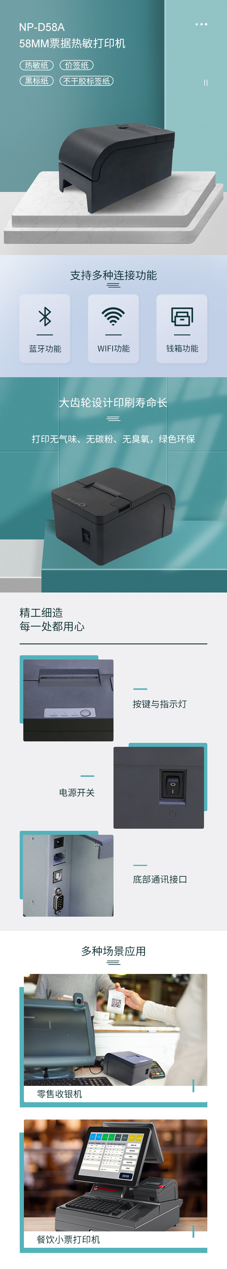 1.易裝紙,手撕切紙 2.大齒輪設(shè)計(jì)打印壽命長(zhǎng) 3.支持價(jià)簽紙,熱敏紙,黑標(biāo)紙,不干膠標(biāo)簽紙打印功能 4.小巧機(jī)身,適用于狹窄的柜臺(tái)空間 5.人性化設(shè)計(jì),紙倉(cāng)開啟角度寬,裝紙維護(hù)便捷