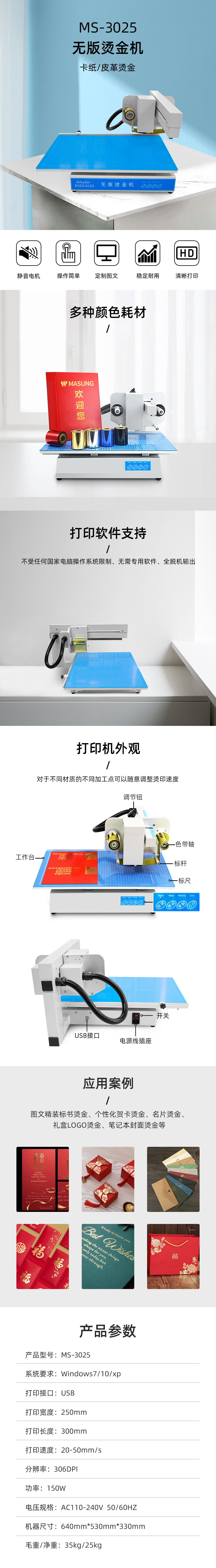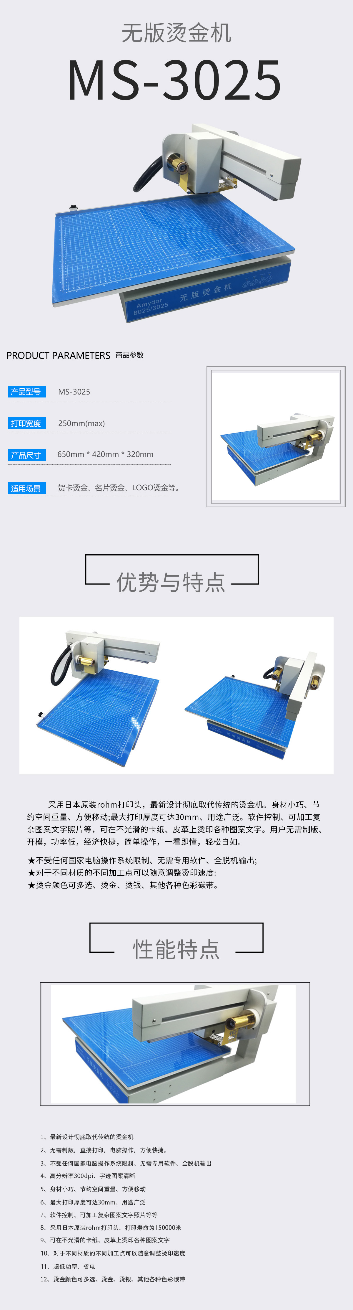 美松無版數(shù)碼燙金機MS-8025,MS-3025采用日本原裝rohm打印頭,最新設(shè)計徹底取代傳統(tǒng)的燙金機。身材小巧、節(jié)約空間重量、方便移動;最大打印厚度可達30mm、用途廣泛。軟件控制、可加工復(fù)雜圖案文字照片等,可在不光滑的卡紙、皮革上燙印各種圖案文字。用戶無需制版、開模,功率低,經(jīng)濟快捷,簡單操作,一看即懂,輕松自如。