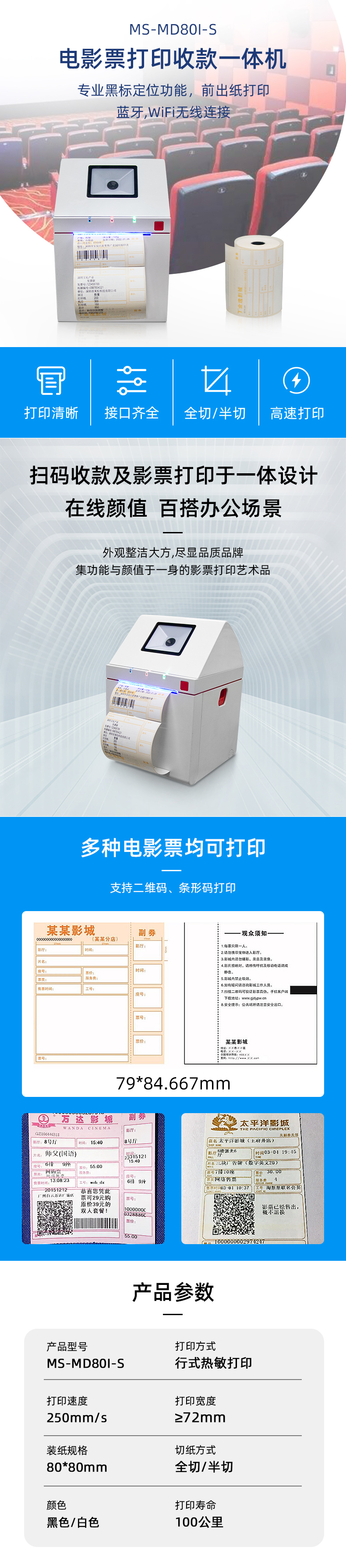 80mm專用型電影票打印機 具有黑標定位紙位置 多種接口連接方式支持 集掃碼收款收銀于一體更加方便快捷