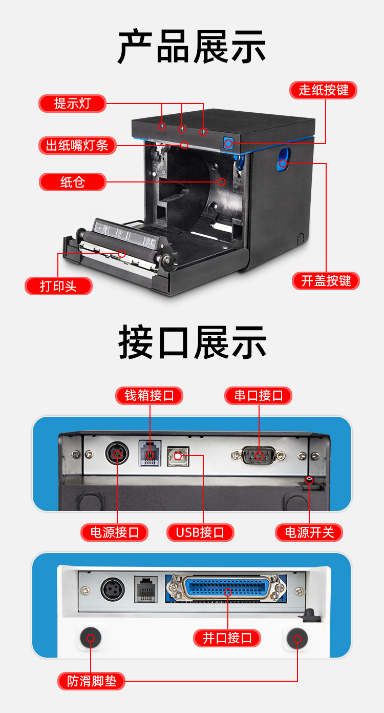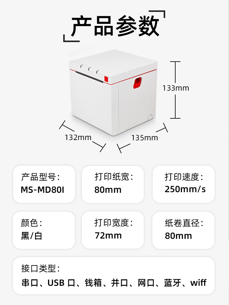 MD80I是一款高顏值的可桌面也可壁掛的票據(jù)打印機(jī)。MD80I外形四四方方的,圓潤一體設(shè)計(jì)、簡于外,精于內(nèi)。流線造型,外觀簡潔大方。顏色搭配顯得更加干凈整潔,可內(nèi)嵌于一些自助ai設(shè)備上,也可直接進(jìn)行使用。MS-MD80I是一款全能的桌面式壁掛式票據(jù)打印機(jī),適用于零售商超、中小電商、倉儲物管、影院娛樂等行業(yè)領(lǐng)域,支持簡體/繁體、英/日/韓文多種國際語言,新零售、跨境電商、影院更適合。MS-MD80I擁有超高速打印速度,采用高級強(qiáng)勁機(jī)芯,打印速度可高達(dá)250MM/S成為市面上同類產(chǎn)品中快速打印的佼佼者,清晰穩(wěn)定與高速皆可兼得帶來顧客滿分體驗(yàn)。MS-MD80I擁有豐富的可選接口,支持RS232串口、USB、網(wǎng)口,可選配藍(lán)牙、WiFi等接口、同時(shí)支持24V錢箱接入、滿足不同的連接需求。專業(yè)黑標(biāo)定位功能,前出紙打印,無線連接,藍(lán)牙接口連接,WiFi接口連接,USB連接,打印機(jī)外殼材質(zhì)高端,內(nèi)置機(jī)芯打印速度快。
