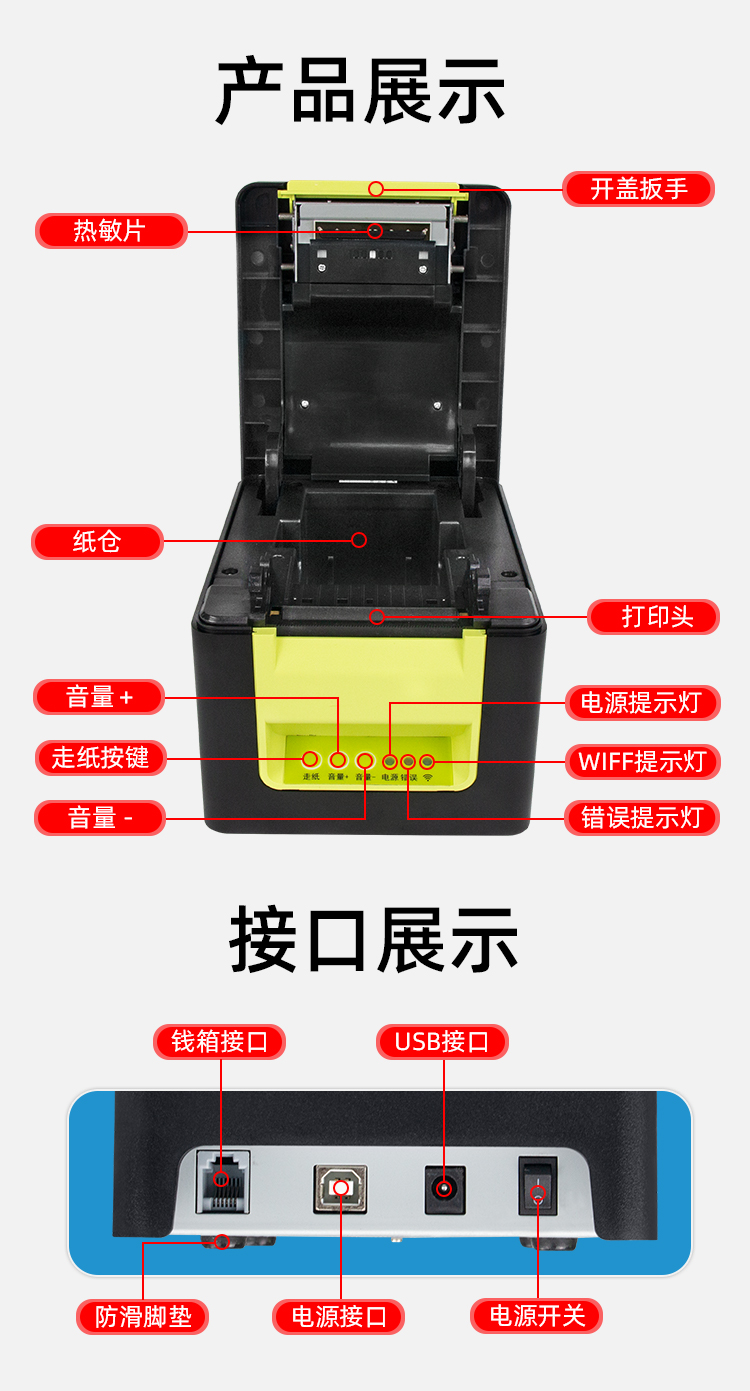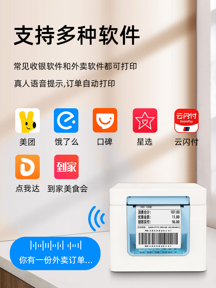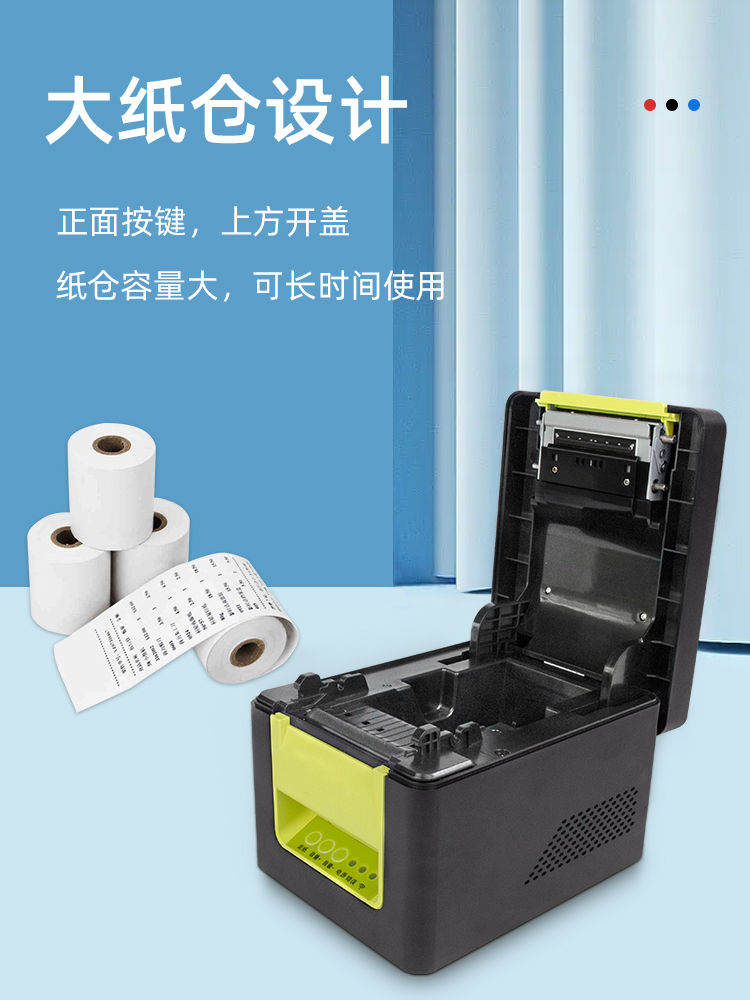 圖形、條形碼以每秒150毫米的速度輸出打印 打印紙厚為0.06~0.12mm熱敏紙 其外觀的清新別致,黑與白是永恒經(jīng)典色,搭配點(diǎn)綴上清新的綠與藍(lán)色 采用插墻式12V電源適配器,方便簡(jiǎn)單又安全,絕對(duì)是您餐飲、商超、彩票、影院的專用打印機(jī)首選