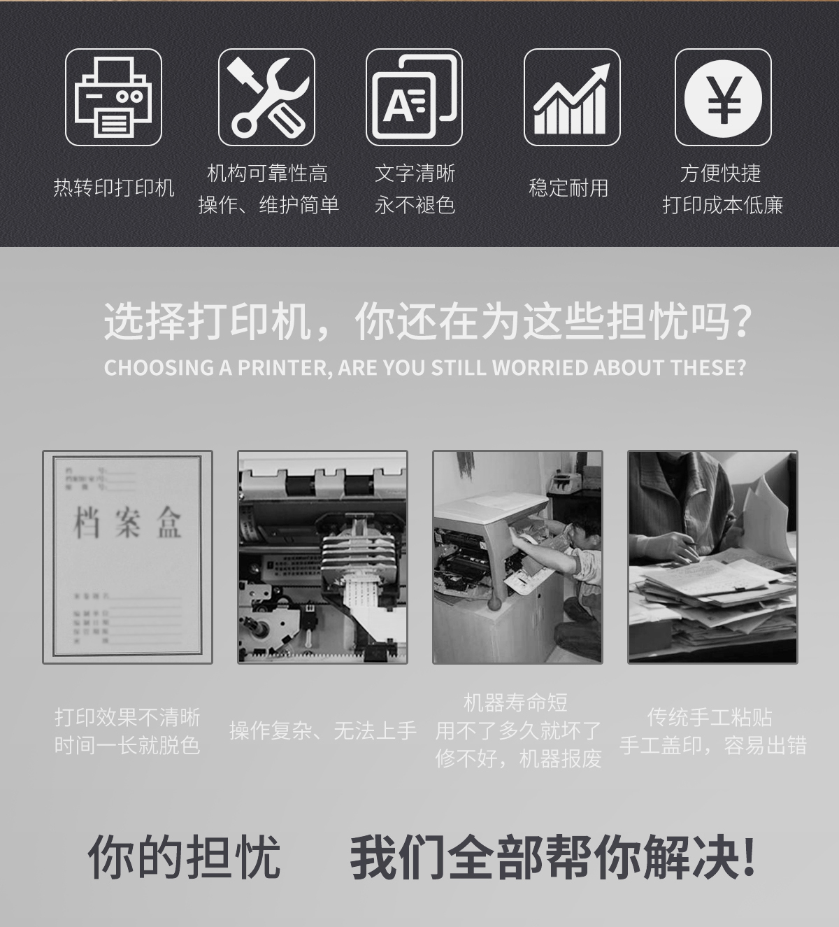 熱轉印打印機原理:熱轉印技術利用碳帶介質通過熱敏片遇熱和壓力轉印到紙或薄膜的過程,當卷宗卷皮的單張空白版面牛皮紙,無酸紙,證件內(nèi)頁紙通過打印機的打印頭和壓軸時,將碳帶上的碳粉轉印到標簽上, 最終形成文字或圖案。