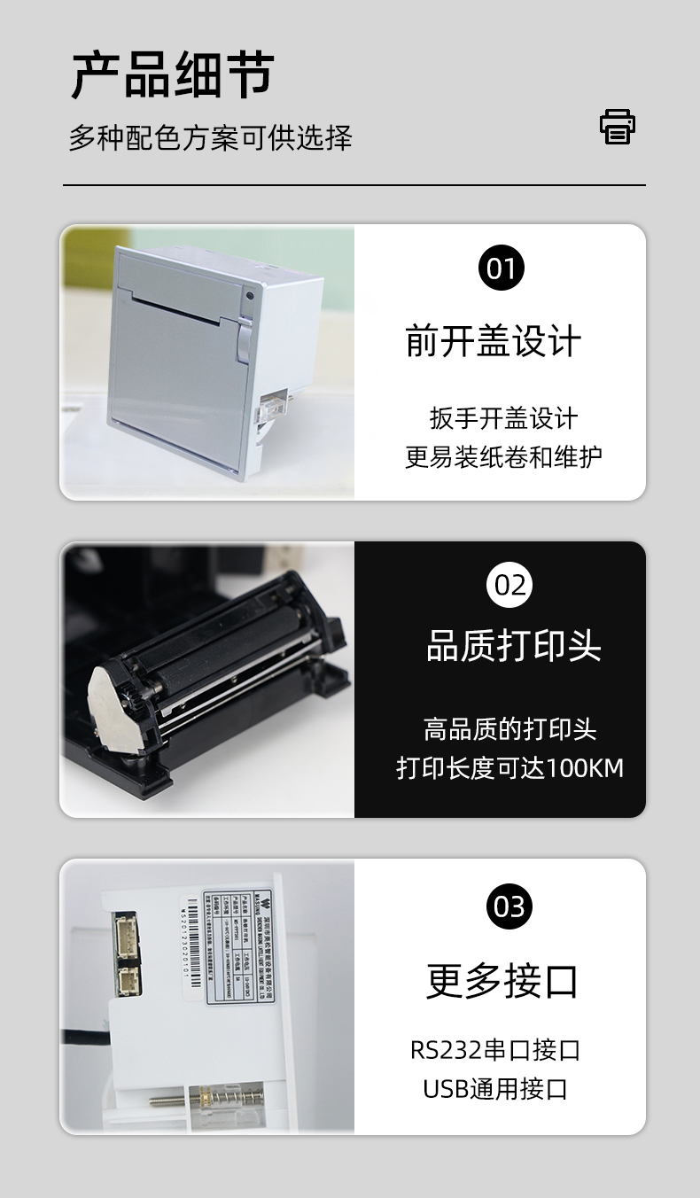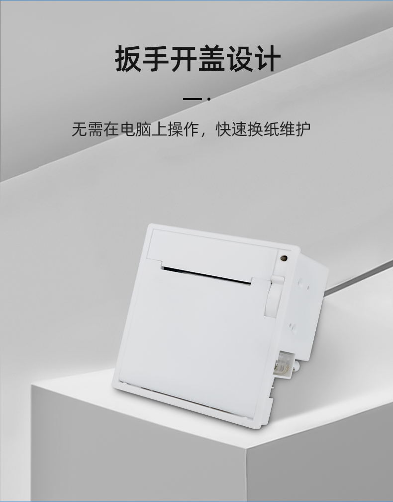 1.大紙倉設計,拒絕頻繁換紙; 2.更快打印速度,提高工作效率; 3.易裝紙設計,扳手或者鑰匙開蓋,放入小票紙,關上機蓋就可使用 4.自動切紙,無人值守嵌入式打印機 5.自動切紙,可調節(jié)全自動切紙、半自動切紙,半自動切紙切完中間會留一點,輕輕一扯就好,無需手動撕紙,以免造成卡紙; 6.一鍵開蓋裝紙換紙,無需打開機柜就可輕松實現裝紙和換紙,簡單方便。