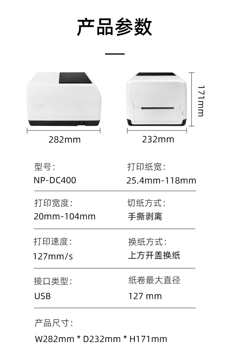 NP-DC400是一款由美松研發(fā)的熱敏/熱轉印標簽標識打印機,具有體型小巧。外觀時尚,擺放方便,打印效果強力的特點。