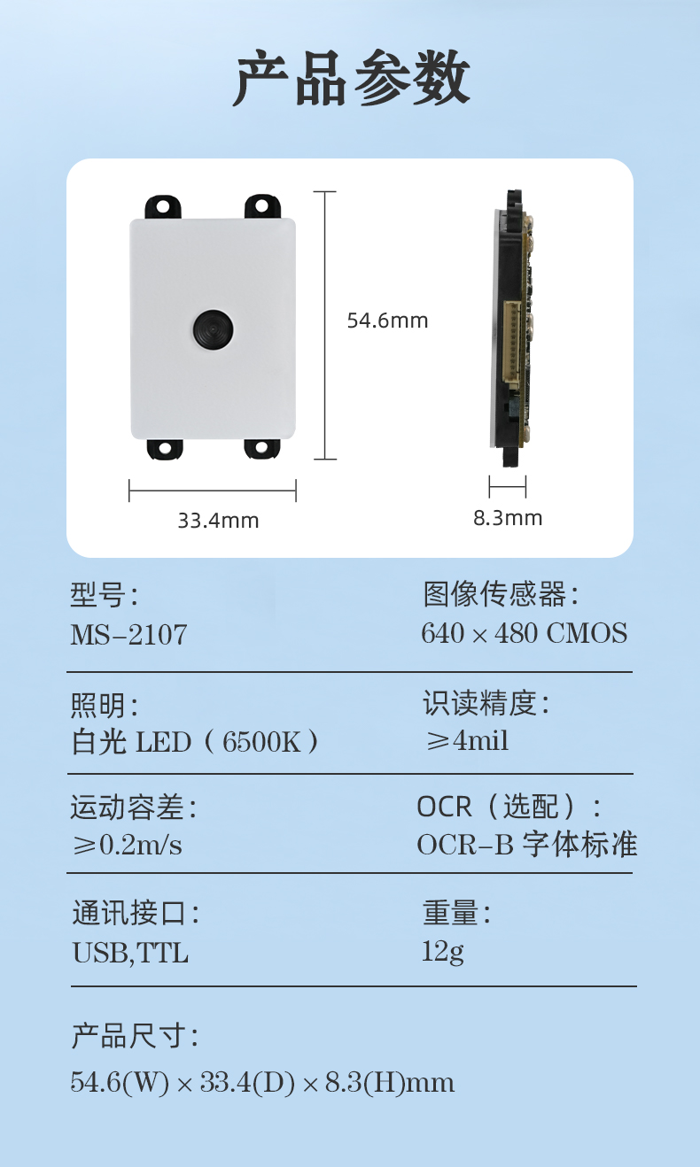 采用自主研發(fā)的核心技術(shù),極速響應(yīng),支持快速開發(fā)和定制需求 角度設(shè)計,手機可以貼的更近 整機厚度僅 8.3MM,更方便集成 對高密,低對比度,色彩條碼有較強的解析能力 多種接口協(xié)議:USB、USB COM、TTL232、RS232、TTL3.3V、TTL5V 等接口 集成蜂鳴器、補光燈、端子于一塊核心板,穩(wěn)定 性更高 可選配 OCR-B 規(guī)范字符識讀 車載 POS、閘機、門禁、電商自提柜、藥品售賣柜、自助查詢、排隊叫號、金融、 醫(yī)療、快遞、收銀等自助設(shè)備等,對電子屏碼應(yīng)用場景尤為適合。