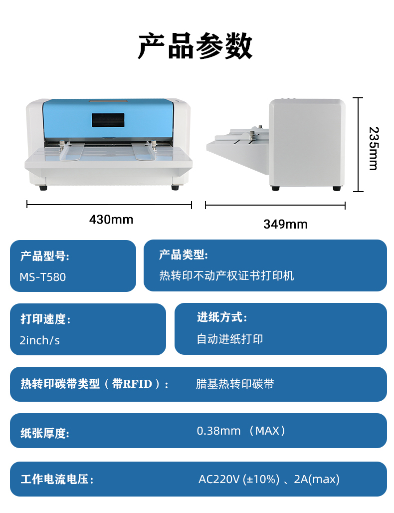MS-T580_熱轉(zhuǎn)印不動(dòng)產(chǎn)權(quán)證書打印機(jī)是由美松自主研發(fā)的新型熱轉(zhuǎn)印行業(yè)打印機(jī),主要應(yīng)用于熱轉(zhuǎn)印打印不動(dòng)產(chǎn)權(quán)證書打印,打印的技術(shù)成熟穩(wěn)定,可快速的進(jìn)行打印,打印的文字和圖像清晰明亮,不輕易褪色。